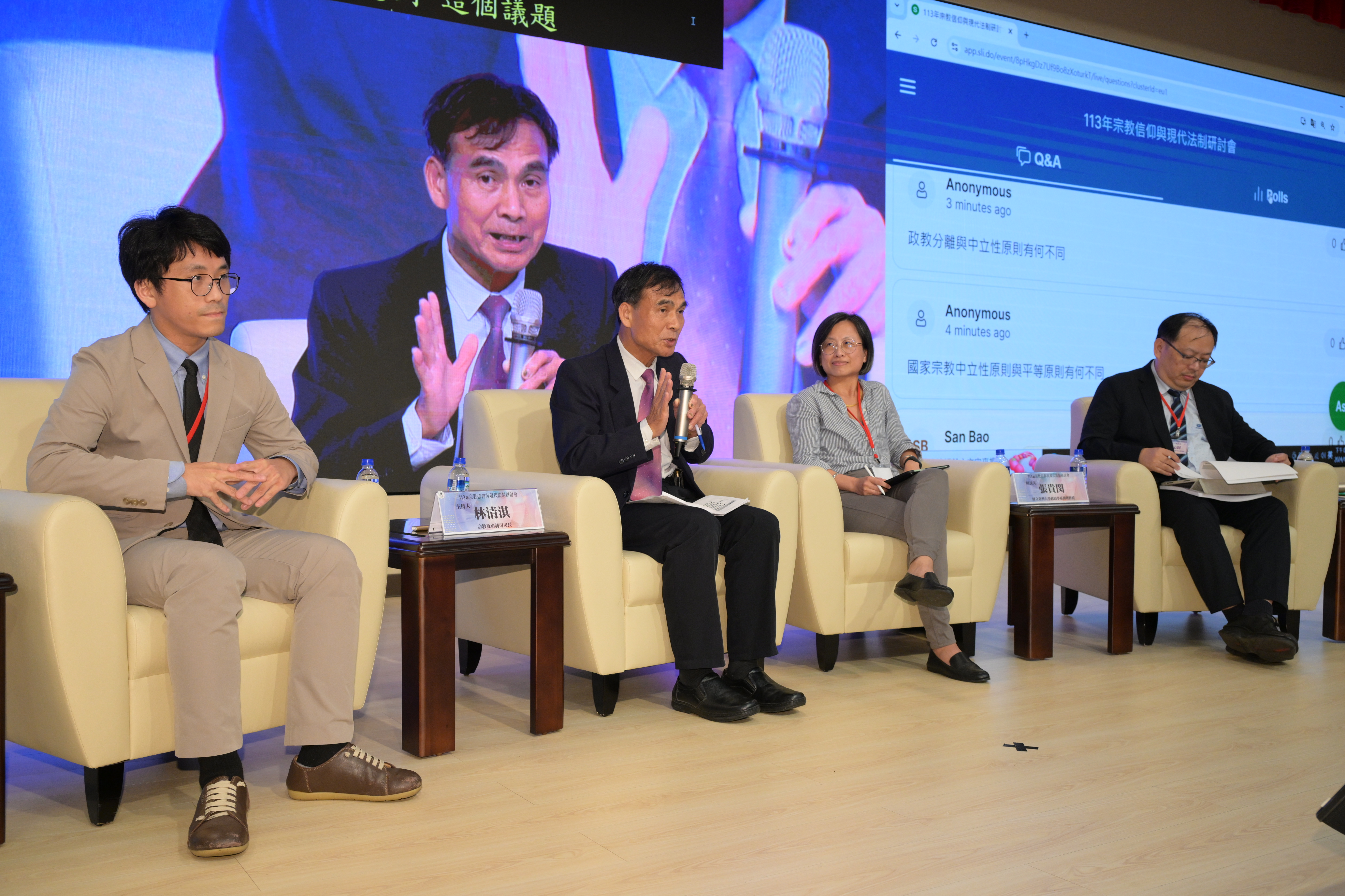 另有4場論壇,主題分別涉及法治素養、環境保育、公益發展以及性別平等,不僅承蒙各領域學有專精之專家學者蒞臨指導,更邀請到中華民國道教會、財團法人台北行天宮、財團法人福智佛教基金會、財團法人基督教晨曦會、一貫道總會、國際佛光會等宗教團體代表經驗分享。由於參與熱烈,各場次討論都欲罷不能,綜合座談時,宗教及禮制司司長林清淇特別針對2天來所有網路線上的提問,包括宗教團體的公益性、宗教師認證、宗教團體財務、宗教立法、宗教本質、以及對政府建議等問題統整回應,但仍因時間有限,無法逐一回覆。